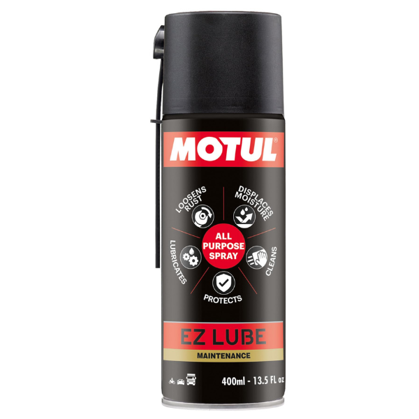 Motul EZ Lube is a versatile multi-function lubricant designed for a wide range of applications. It effectively lubricates mechanisms like levers, cables, brake axes, clutch systems, hinges, joints, and chains while preventing squeaks and jamming. The product also de-oxidizes and loosens rusted parts such as nuts, screws, and locks. Its protective film shields against corrosion, humidity, and wear, making it suitable for outdoor preservation and winter storage. It is safe on paints, rubber, and plastics and can be used on electrical circuits to displace moisture. The sprayable formulation includes a fluorescent color for easy application, and it is packaged in a 400mL aerosol can with safety precautions for flammable content.